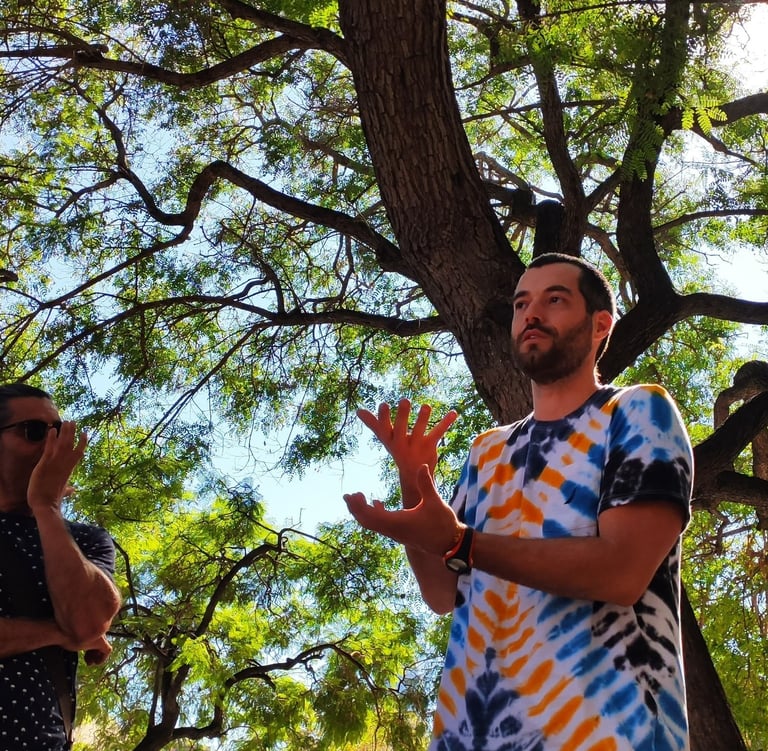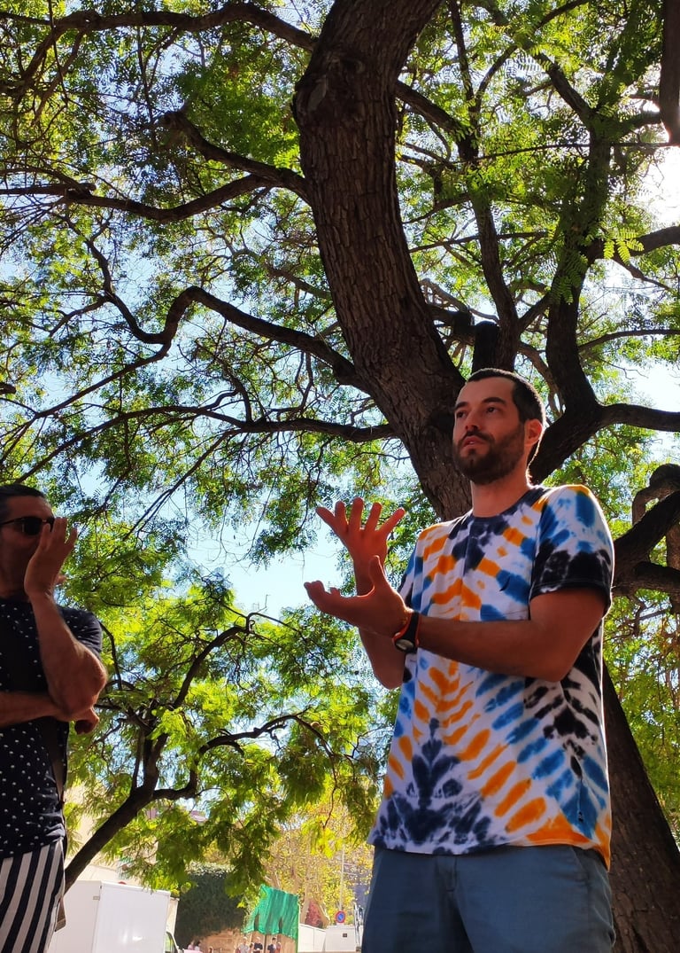 En esta actividad se desarrolla la presencia, la capacidad de escucha, de juego, de comunicación y creación, el sentido del humor y el contacto con el otro y con el público.
