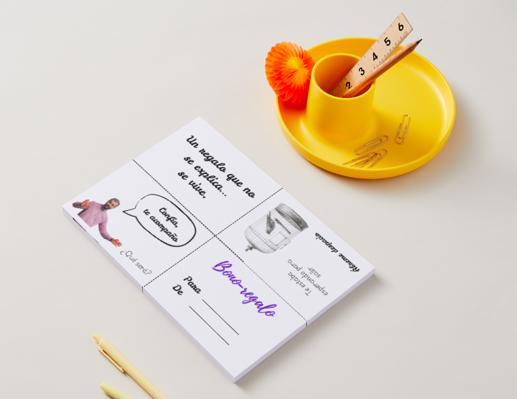 Cada bono-regalo de Reclownexion es personalizado y tangible, para que regales algo que se pueda tocar. La portada invita a abrirlo despacio, y al desplegarlo, cada pliegue revela un poco más de la experiencia que has regalado, dejando que quien lo reciba adivine este misterio.